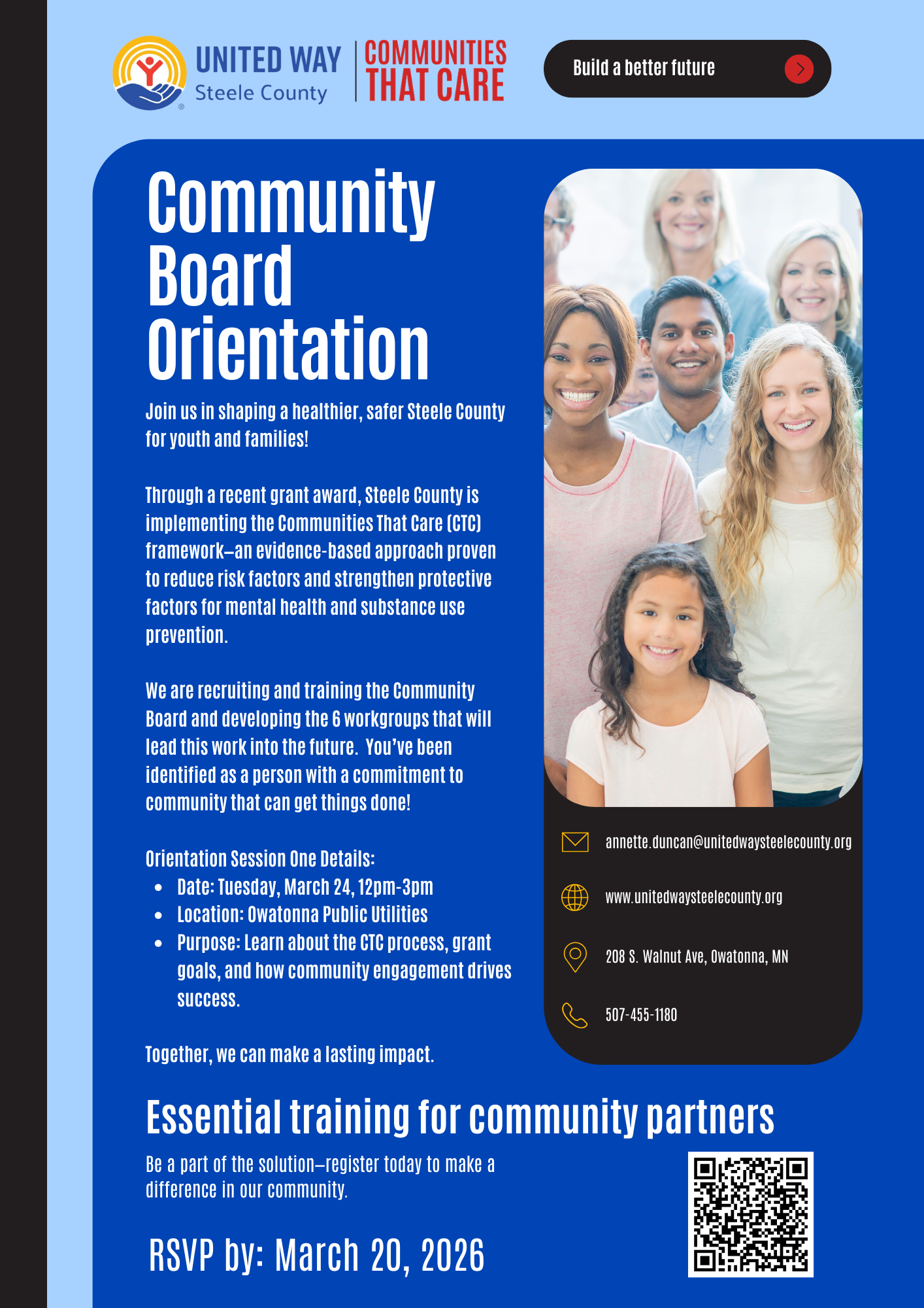 Join us in shaping a healthier, safer Steele County for youth and families! Through a recent grant award, Steele County is implementing the Communities That Care (CTC) framework - an evidence based approach proven to reduce risk factors and strengthen protective factors for mental health and substance use prevention.